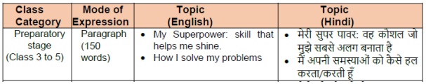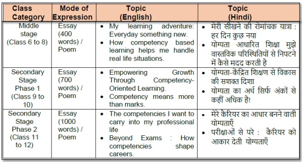 Dear parents CBSE is organizing an Expression Series on the theme Competency Focused Education. Details are as follows: Note: 1. Paragraphs / Essays may be written in Hindi or English. 2. Shortlisted activity will be sent to CBSE. 3. The activity will be held in the school on Saturday, 19 July 2025. It is mandatory to participate in this activity